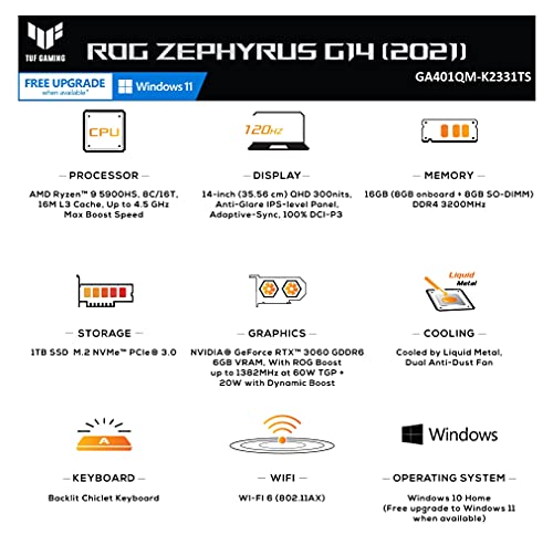 ASUS ROG Zephyrus G14 (2021) 14-inch (35.56 cms) QHD 120Hz, AMD Ryzen 9 5900HS, RTX 3060 6GB Graphics, Gaming Laptop (16GB/1TB SSD/Office 2019/Windows 10/Gray/Anime Matrix/1.7 Kg), GA401QM-K2331TS