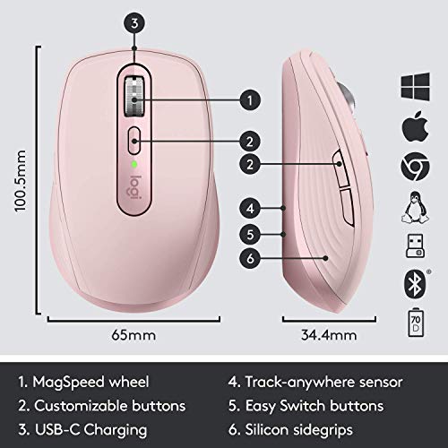Logitech MX Anywhere 3 Compact Performance Mouse, Wireless, Comfort, Fast Scrolling, Any Surface, Portable, 4000DPI, Customizable Buttons, USB-C, Bluetooth – Rose